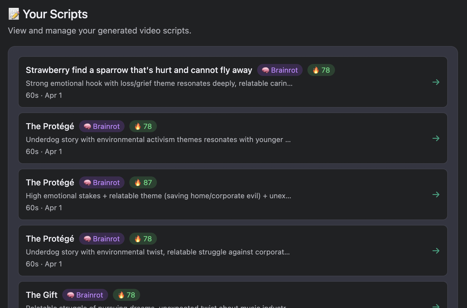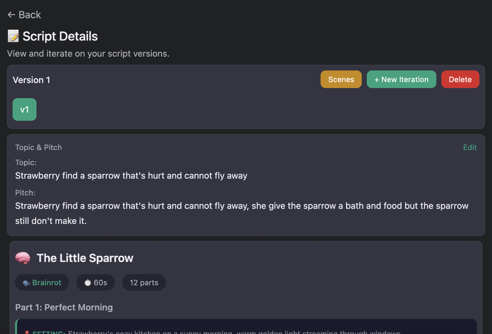 In My Scripts → select your script → click the Scenes button to generate a scene-by-scene breakdown with image and video prompts: